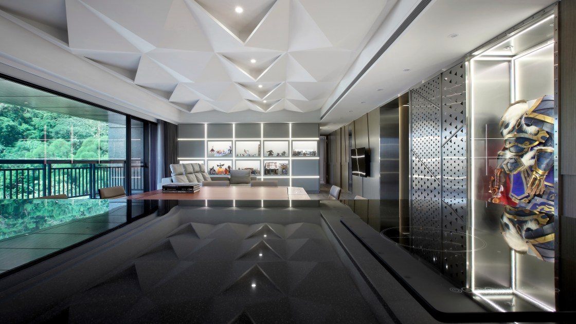 而如何陳列這些寶貝在空間之中,不顯凌亂且有創意的呈現.我們透過幾何線條的構成,將鎧甲的元素解構,轉化為天花及牆面造型,並結合智能燈光氛圍的營造,創造出獨特個性的住宅空間。